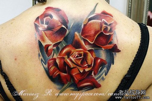 女生背部时尚精美的欧美彩色玫瑰花纹身图案