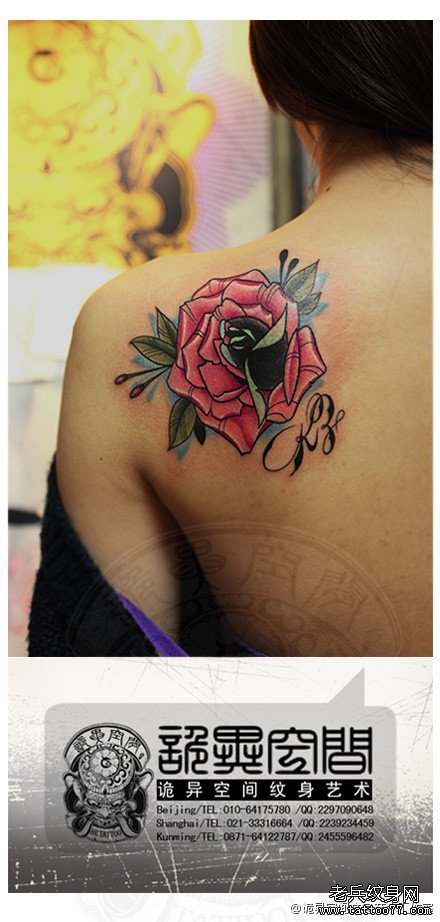 美女后肩背漂亮经典的玫瑰花纹身图案