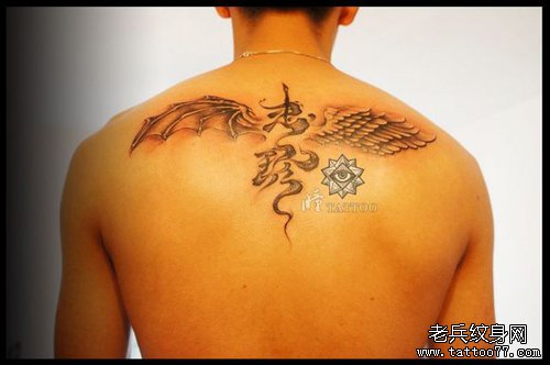 男生后背经典的一半天使一半恶魔翅膀纹身图案