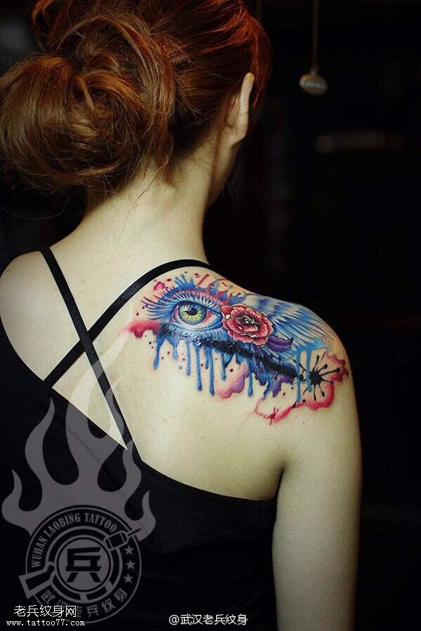 兵哥凌晨加班制作的肩膀彩色亮丽的眼睛翅膀纹身作品