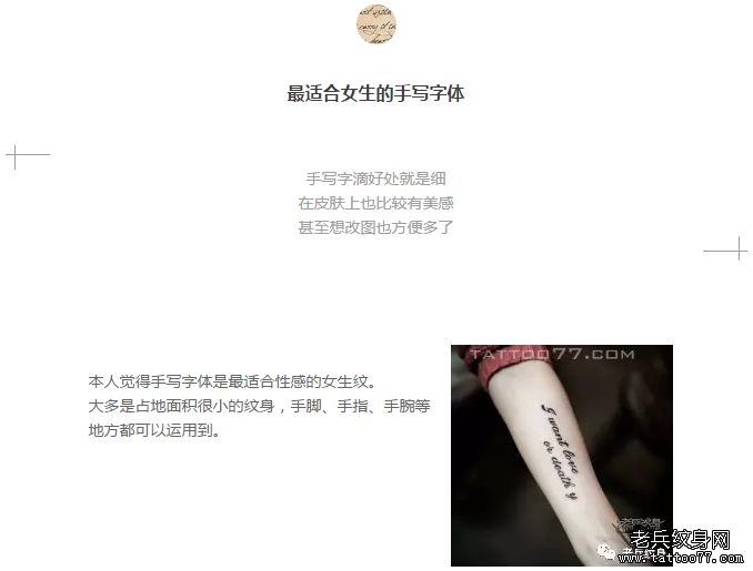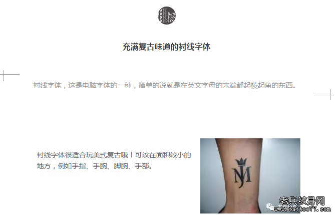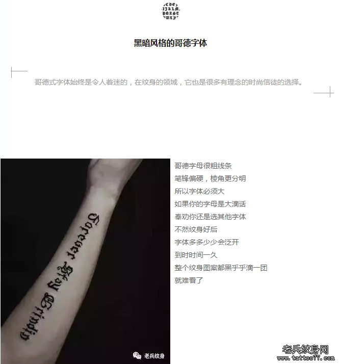 纹身是一种古老的艺术,十分有意义的是纹身所具有的丰富的艺术特性和新奇多样的形式。纹身一般就是纹图案和文字,在这篇文章中我们关注的是一个纹身艺术中十分具有价值的元素部分——字体的选择。