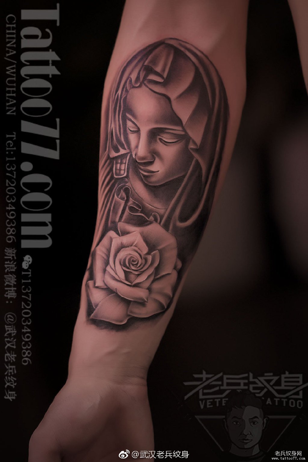 小臂黑灰圣母纹身